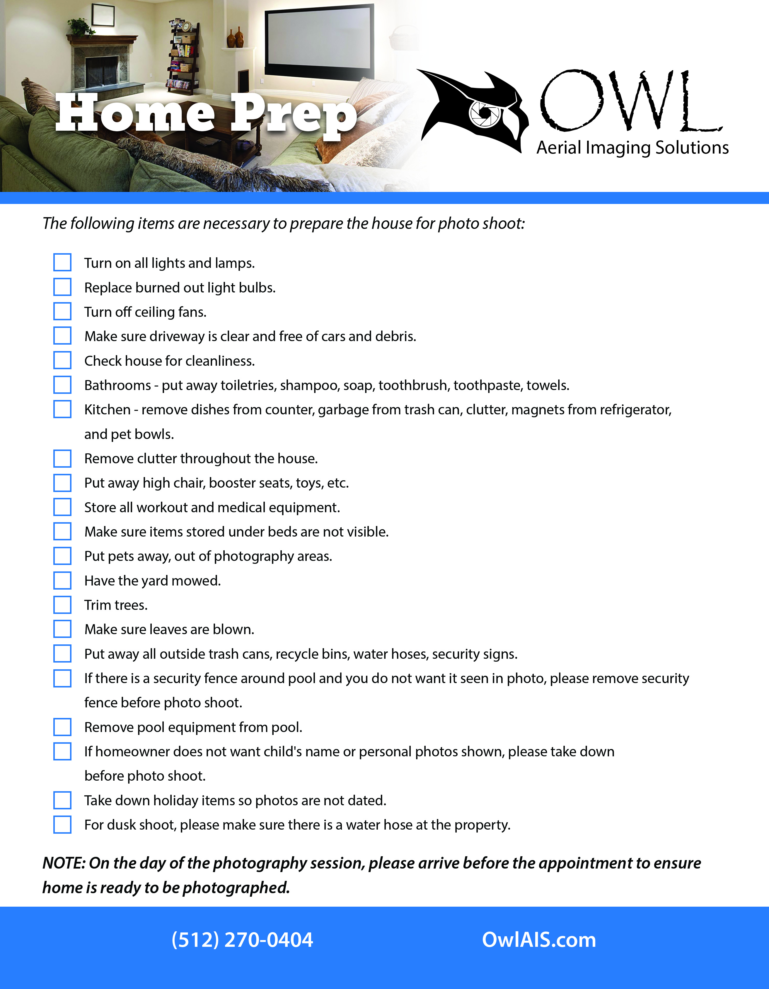 After setting an appointment with Owl Aerial Imaging Solutions, please review the home preparation flyer to ensure your property is ready for the photo shoot. Here you will see all those requirements for photography